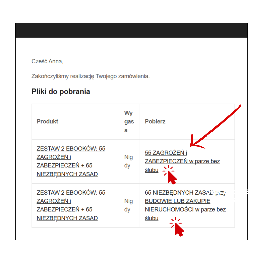 Produkty wysyłane są automatycznie od razu po zakupie na Twój adres e-mail podany w zamówieniu. Wystarczy kliknąć w link z nazwą produktu w tabelce z napisem PLIKI DO POBRANIA. Możesz więc znaleźć bezpieczne rozwiązanie dla swojego związku już DZIŚ !