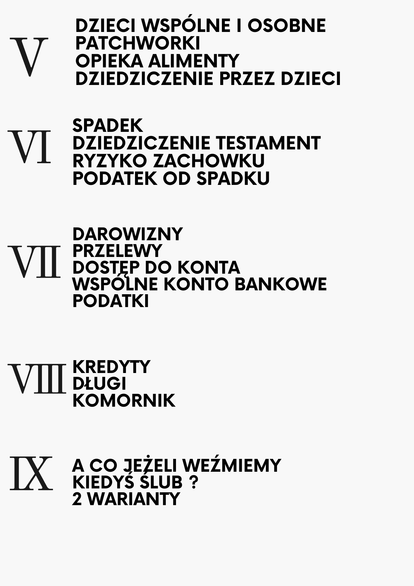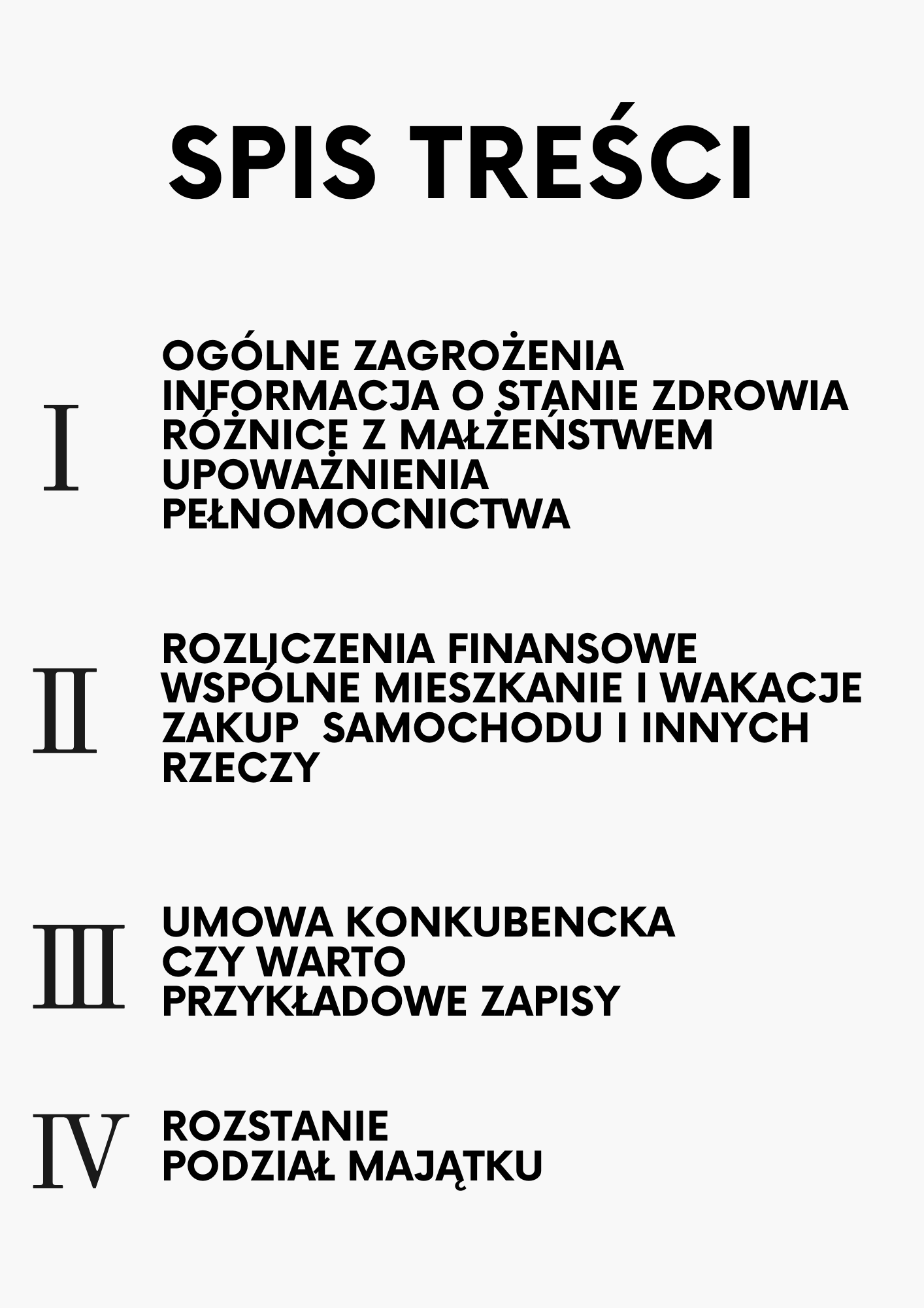 Ebook zawiera aż 55 popularnych ZAGROŻEŃ występujących w parach żyjących bez ślubu, czyli związku nieformalnym oraz PROPOZYCJE ZABEZPIECZEŃ w celu uniknięcia tych zagrożeń i stworzenia poczucia bezpieczeństwa w tej relacji.