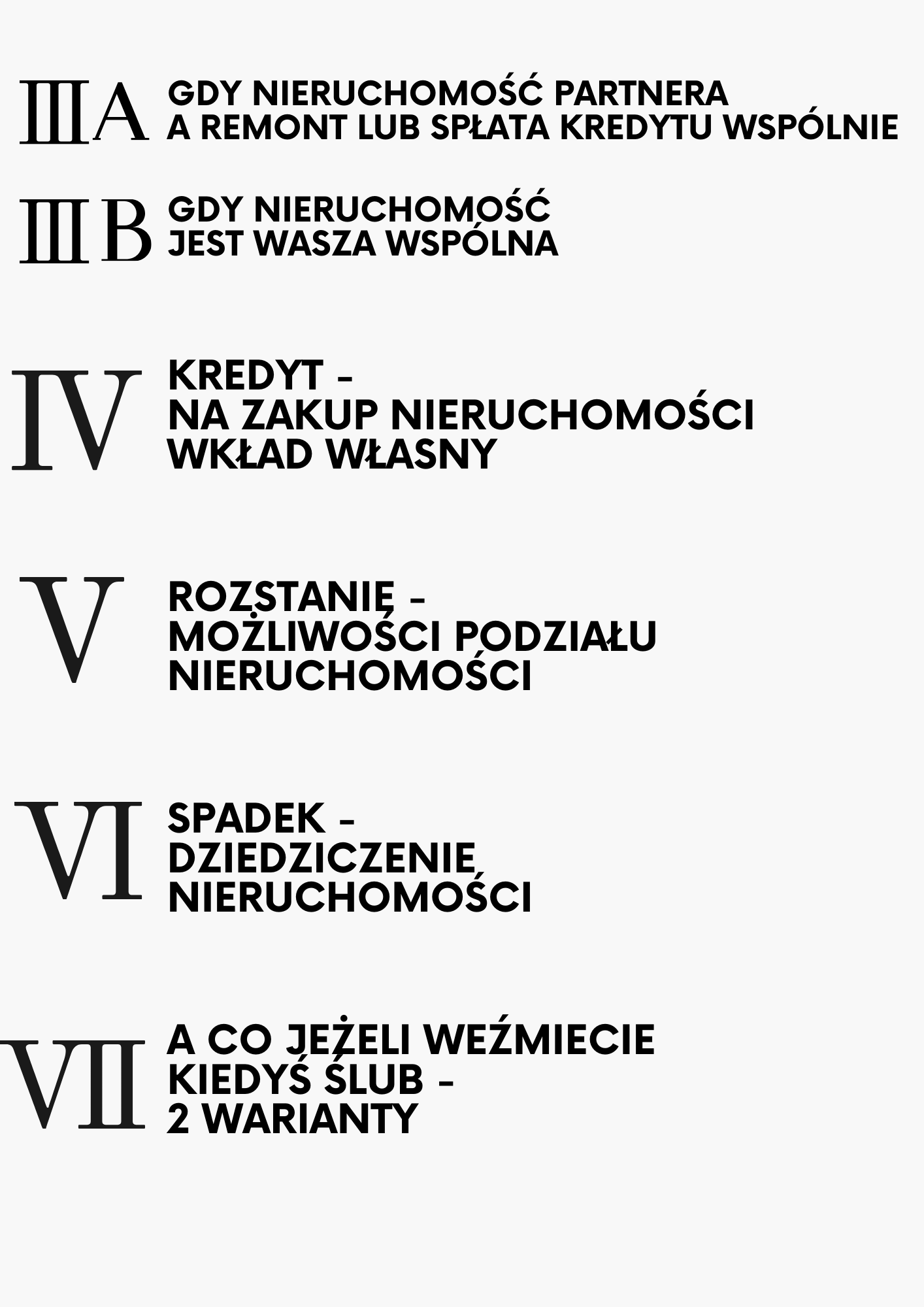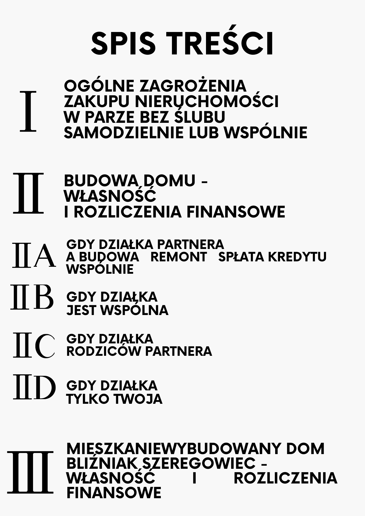 Zagadnienia odnoszą się do inwestycji: budowy domu, w tym na działce jednego partnera, na działce rodziców partnera oraz na wspólnej działce. Ponadto odrębnie opisane zostały zagadnienia związane z zakupem domu, mieszkania, bliźniaka, szeregowca, zarówno gdy nieruchomość kupuje jeden partner, jak i gdy jest to wspólna inwestycja.